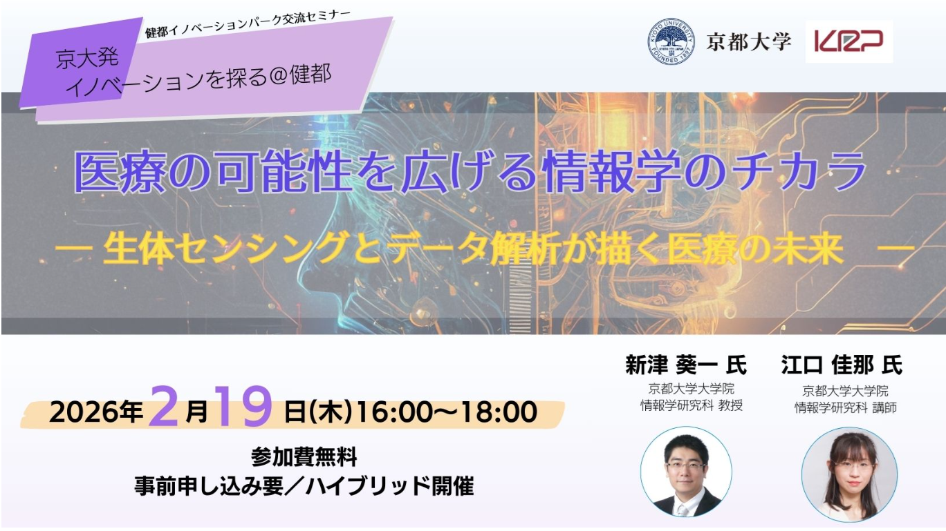 このセミナーでは、「情報学の医療への貢献」をテーマに、生体センシング技術と医療データ解析の両面から研究を進める京都大学大学院情報学研究科の研究者2名を講師に迎え、生体センシングとデータ解析が描く医療の未来を俯瞰し、情報学が拓く医療の可能性を考える機会とします。
