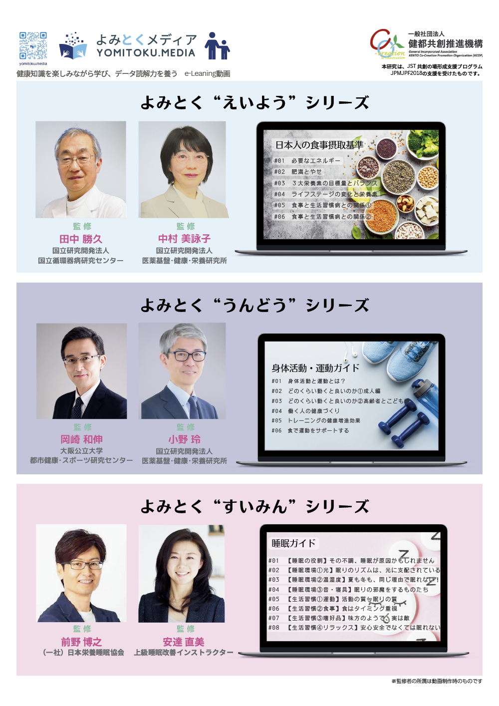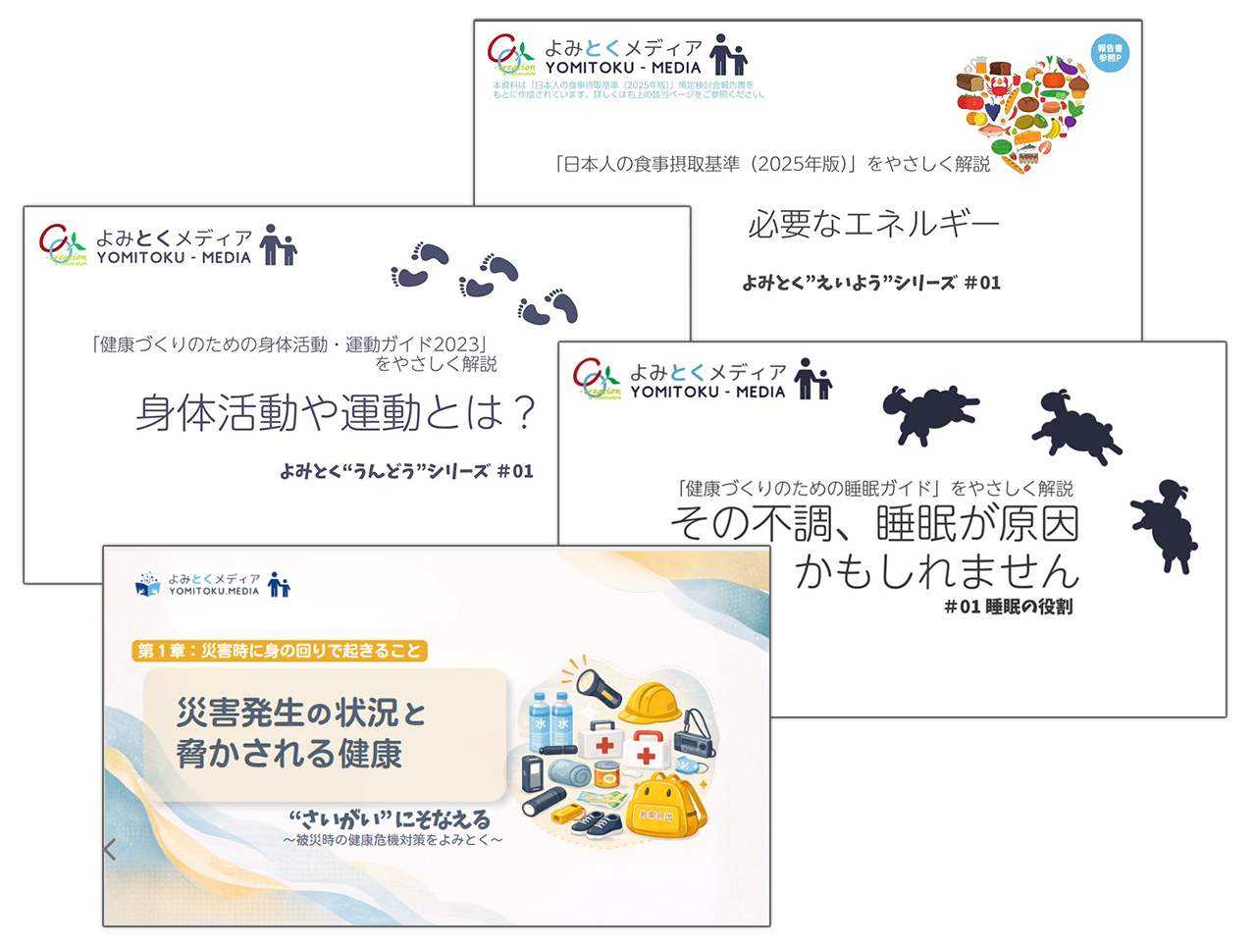 おとなからこども(小学校高学年程度)まで、幅広い世代に理解できる分かりやすい内容を心がけた、健康情報を自身でよみ(読み)、とく(解く/説く)ことができる人々を育成することを目的にしたコンテンツをラインアップしていきます。